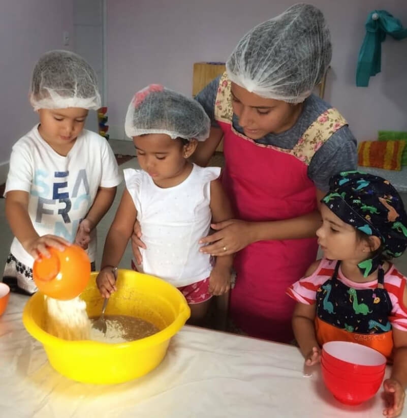 Já no caso de restrições alimentares, a família informa a nossa equipe sobre as especificidades da alimentação da criança e, a partir daí, adaptamos e preparamos especialmente todas as refeições dela.